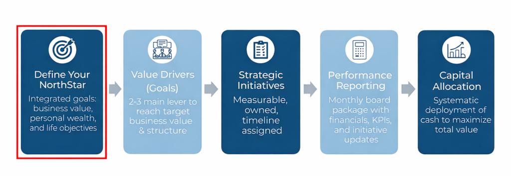 This is why it’s the starting point of our entire NorthStar Value Creation system. Because without direction, all the strategy and tactics in the world won’t get you where you want to go. Or worse – they’ll get you efficiently to somewhere you never wanted to be.
